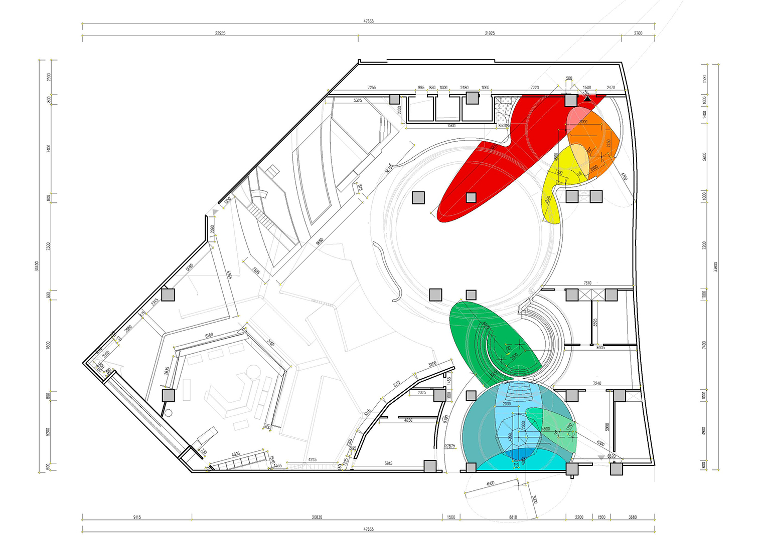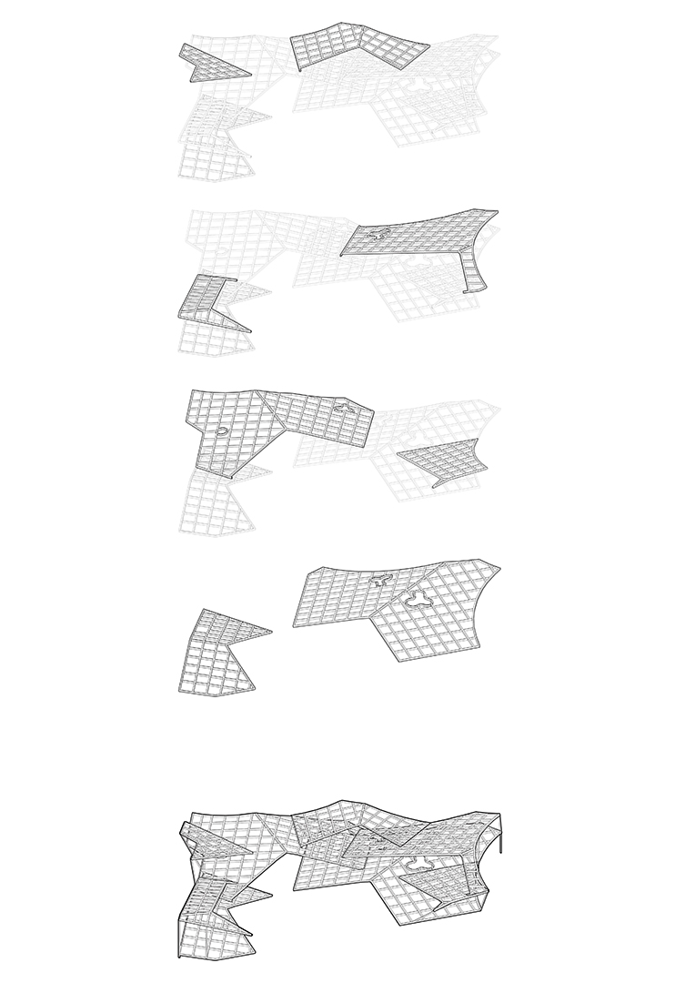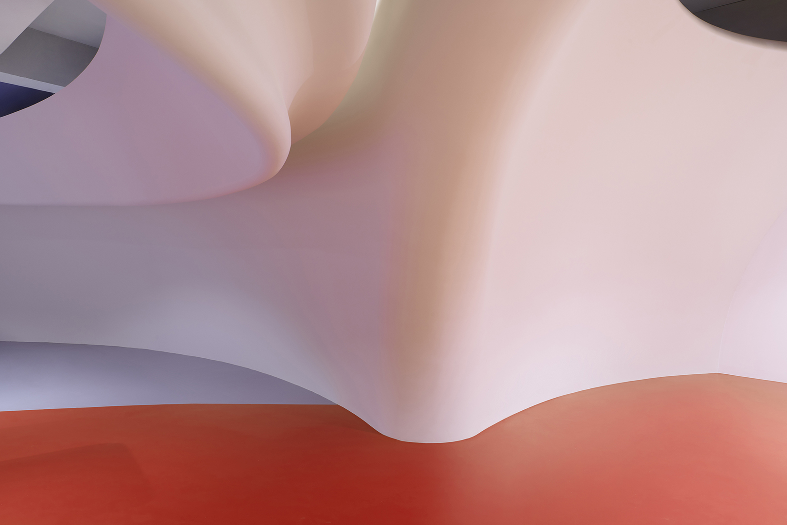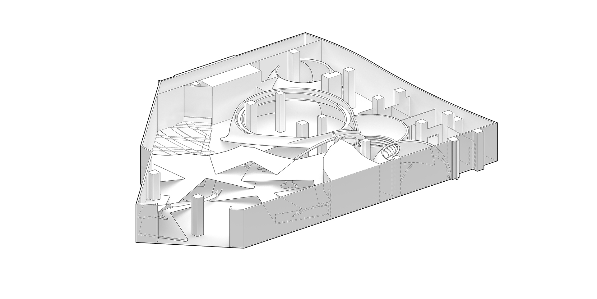 Then, SpActrum began to explore the design language. We considered that the overall form should have the enlightening of the cosmogenic origin. High-speed and high-energy is the daily condition here, but the whole universe seems as it stops. What we want to express is the extreme speed movement hidden in the stillness like this, so we returned to the primary sphere. Through multidirectional transformation, the plane evolves into a series of slopes that can walk and climb, which would retain the memory of the terrain. Finally, the space is divided into two parts, the "universe" area evolved from the sphere and the "mountain" area consist of the slopes.