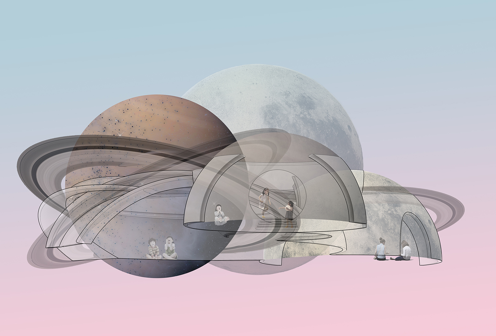 In this project, SpActrum attempted to give a chance for children to reconnect with nature. At the front space of the site, kids could run on the hillside and explore in the different caves. At the rear space of the site, according to the different size of the enclosed area surrounded by the cutting sphere, they could become different spaces. It could be a display wall, a small theatre with wooden steps. As well as, It could become an inverted bowl space, which is an excellent place for children to hold a party.