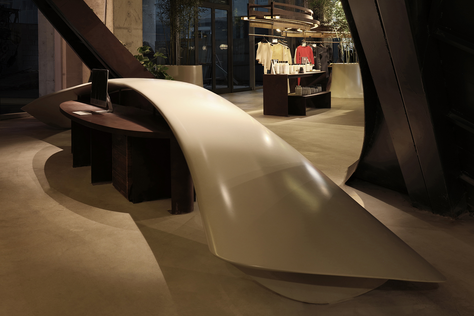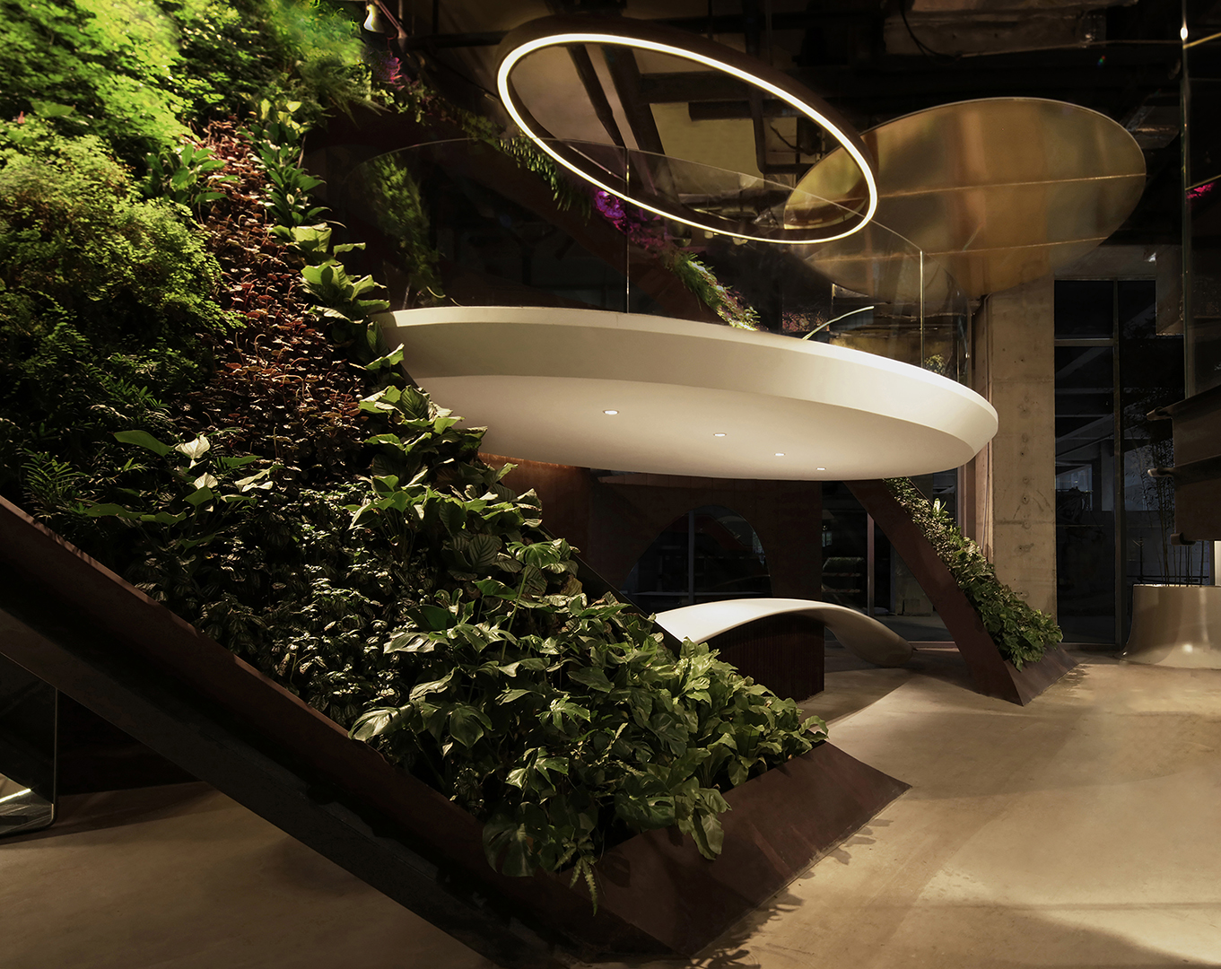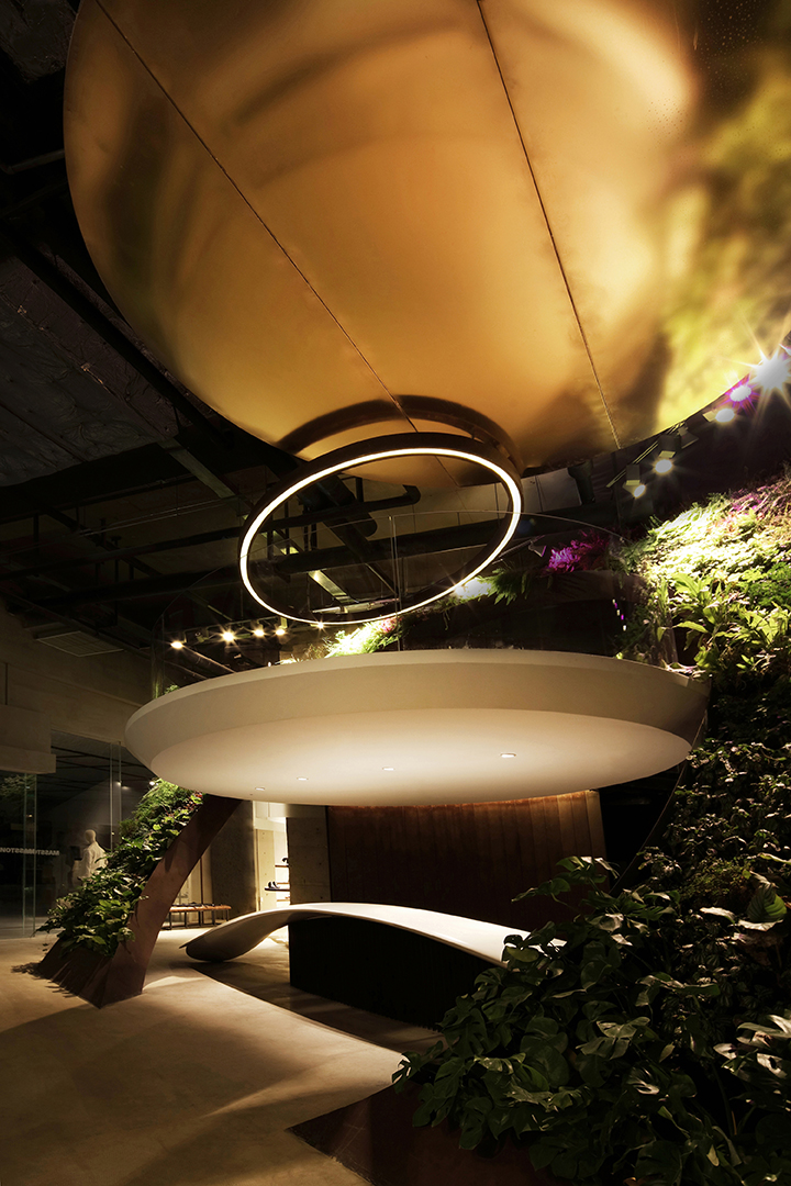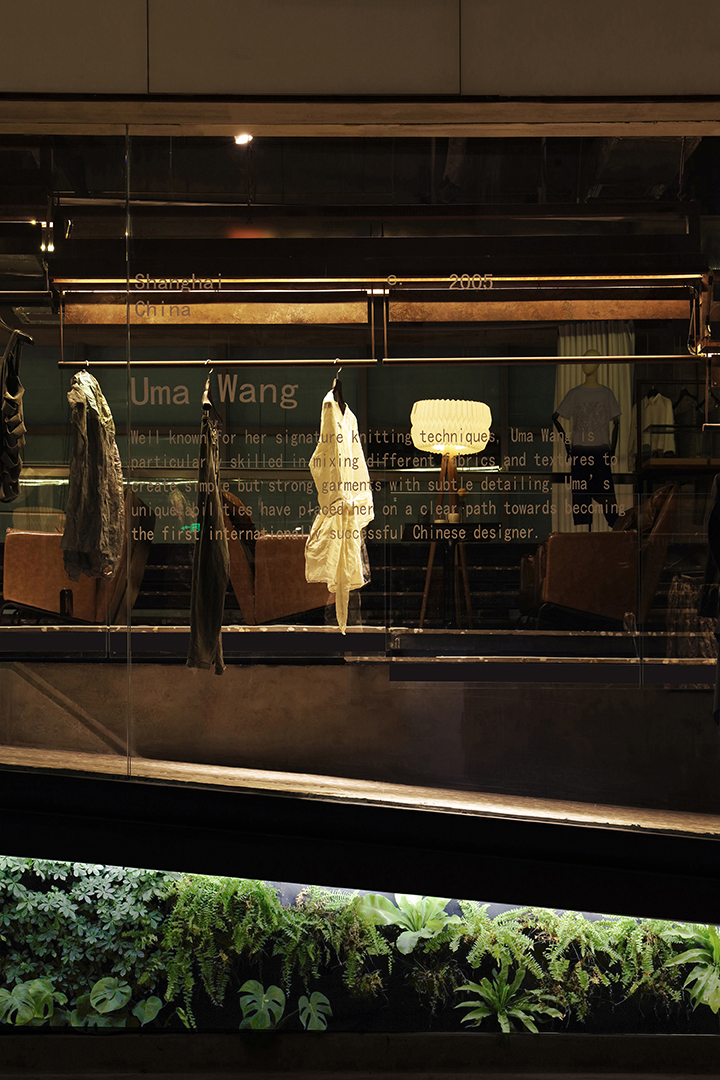The elevated platform becomes an ambiguous space, with its interlaced paths encouraging people to linger. The sale and displays of fashion are mainly arranged on the first floor, with huge hanger tracks made of steel floating in the air. At night, the built-in lighting system makes these steel hangers exhibit a visual quality, like flowing lava. On the east side of the shop is a huge floor-to-ceiling glass window facing the proposed Bar Street. On the west side of the store, the ramp divides the long facade facing the inner space of the mall. At the north end of the store, a steel bevel leaning against the concrete wall and the triangular wall under the ramp, are covered with vertical plants. The auto-irrigated green walls create a green valley, forming a second entrance.