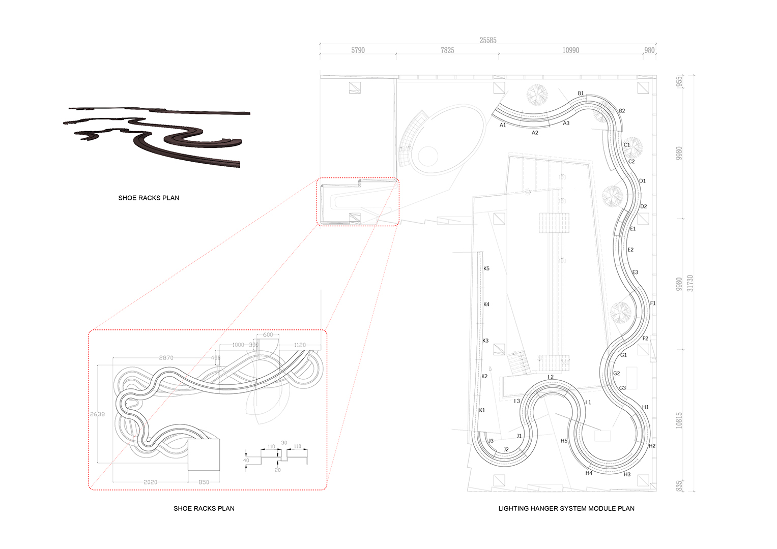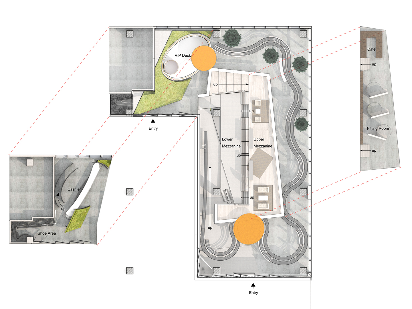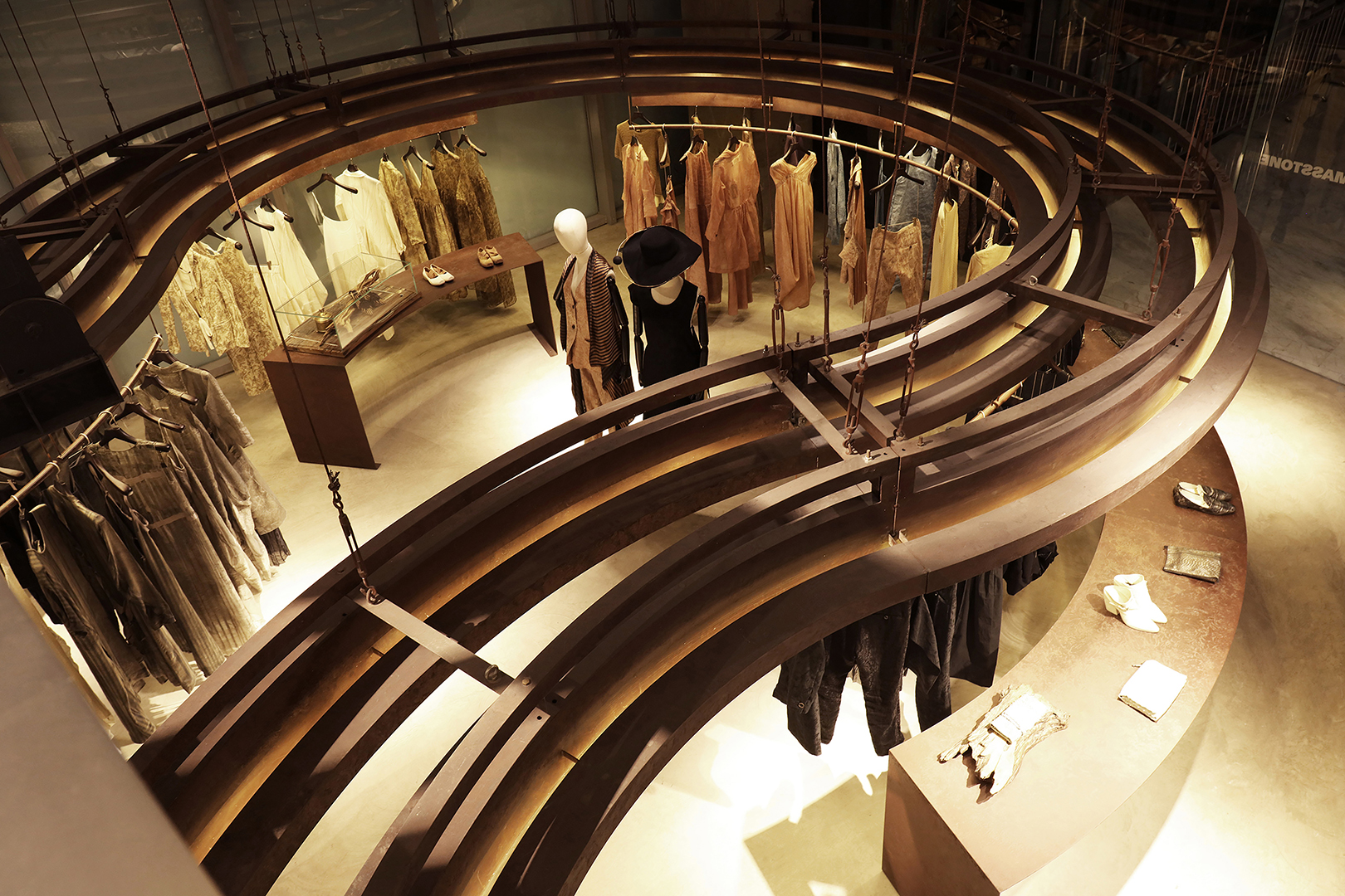 The elevated platform becomes an ambiguous space, with its interlaced paths encouraging people to linger. The sale and displays of fashion are mainly arranged on the first floor, with huge hanger tracks made of steel floating in the air. At night, the built-in lighting system makes these steel hangers exhibit a visual quality, like flowing lava. On the east side of the shop is a huge floor-to-ceiling glass window facing the proposed Bar Street. On the west side of the store, the ramp divides the long facade facing the inner space of the mall. At the north end of the store, a steel bevel leaning against the concrete wall and the triangular wall under the ramp, are covered with vertical plants. The auto-irrigated green walls create a green valley, forming a second entrance.