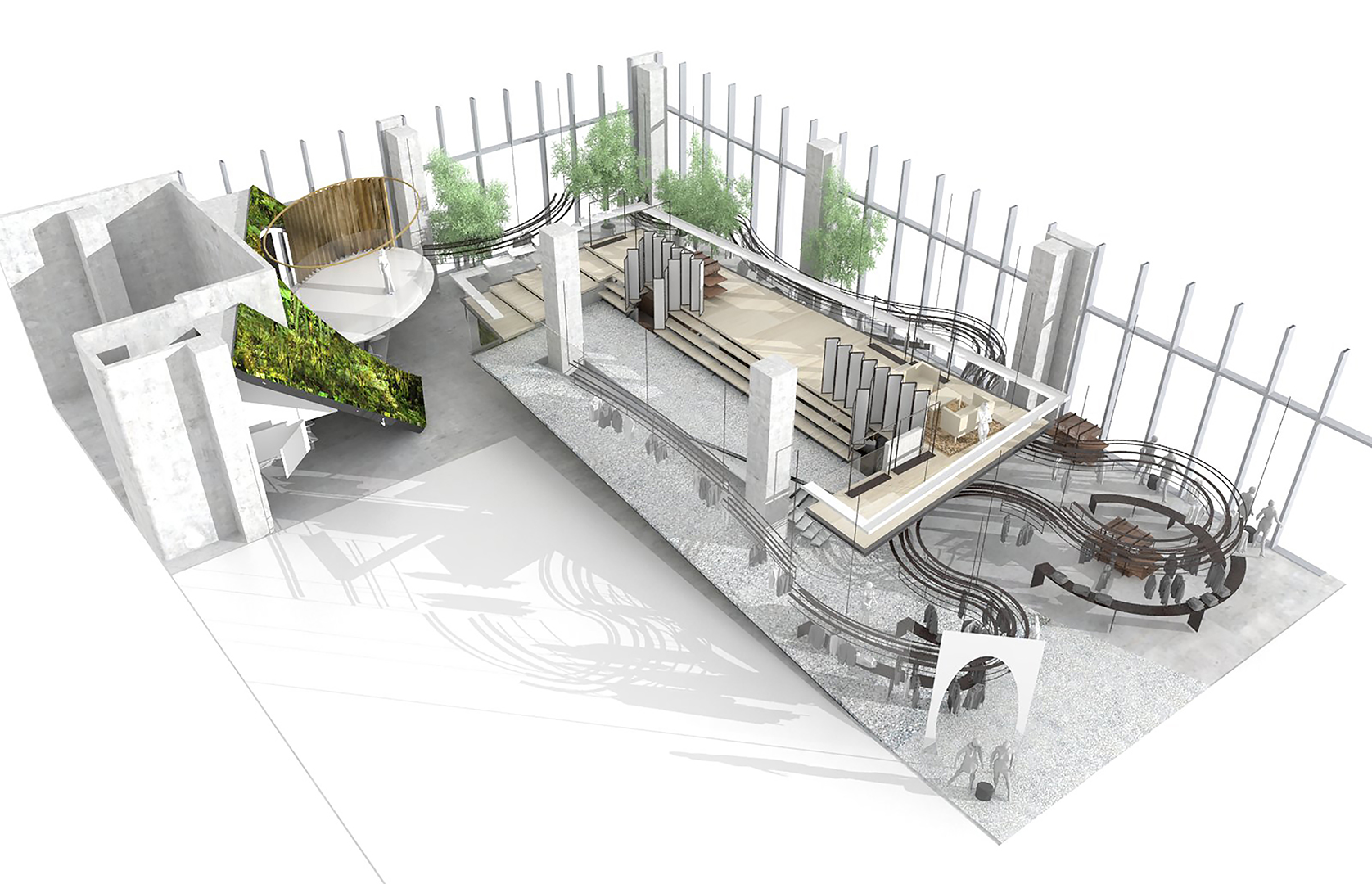 The design concept came from a straight fusion of fashion shows and natural stone forms. Inspired by the floating stands around the show stage, which simulate the ups and downs of stacked rocky paths, the basic concept was born: there would be an inner garden, inheriting the modernist tradition, omitting decoration and narrative, and providing a venue for multiple events by using basic architectural features, such as ramps, platforms, and ladders. The paths follow the movements of purposeful people, while lingering is triggered by spontaneous reactions, diverting them from the original paths, and represent a state of indulgence in the space without any specific purpose.
