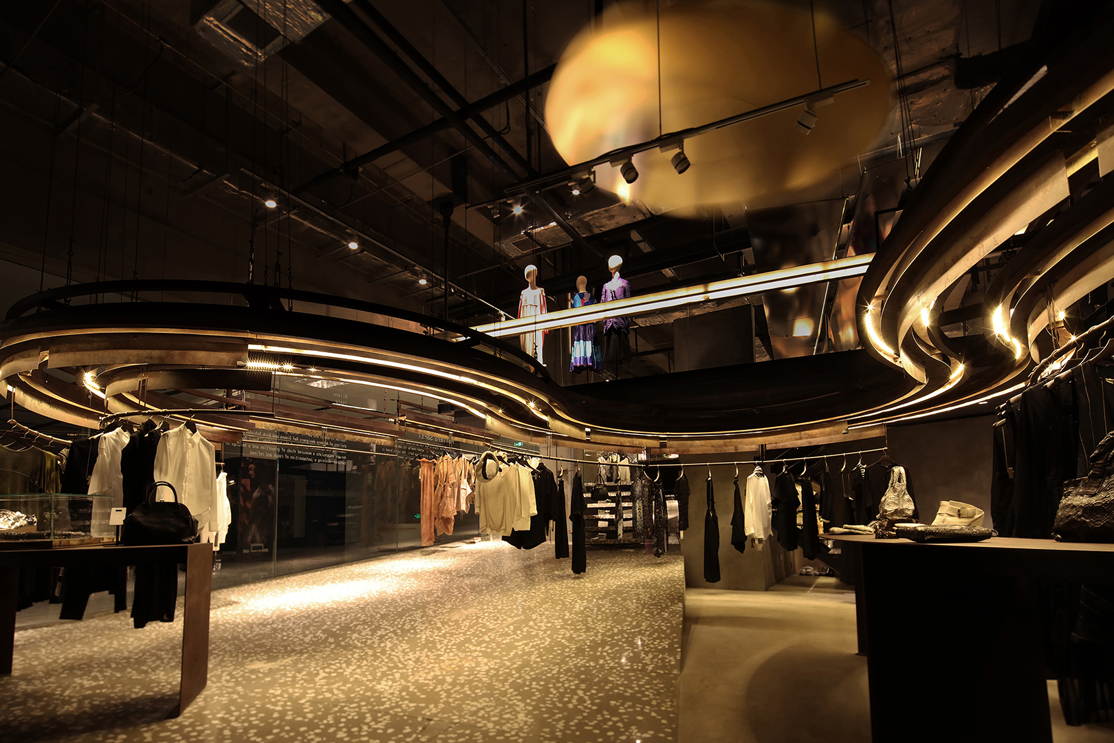 Models walk on the runway from the beginning of the ramp to the end; customers wander from the fitting room to the cashier, while waiters taking the coffee step on to the leisure platform. There are numerous separate movements interactively weaving through the space, defining the MASSTONE Fashion Boutique in Taiyuan, a project conceived and designed by SpActrum.